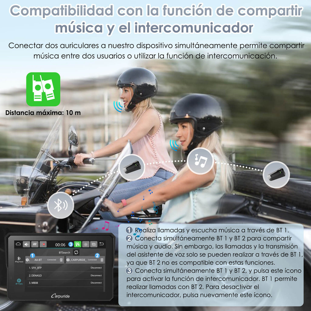 Función de intercomunicador: Conectar dos auriculares a nuestro dispositivo simultáneamente permite compartir música entre dos motoristas o utilizar la función de intercomunicación. (Nota: el modo intercomunicador y el modo de transmisión Bluetooth no pueden usarse simultáneamente; solo se puede activar uno de ellos.)